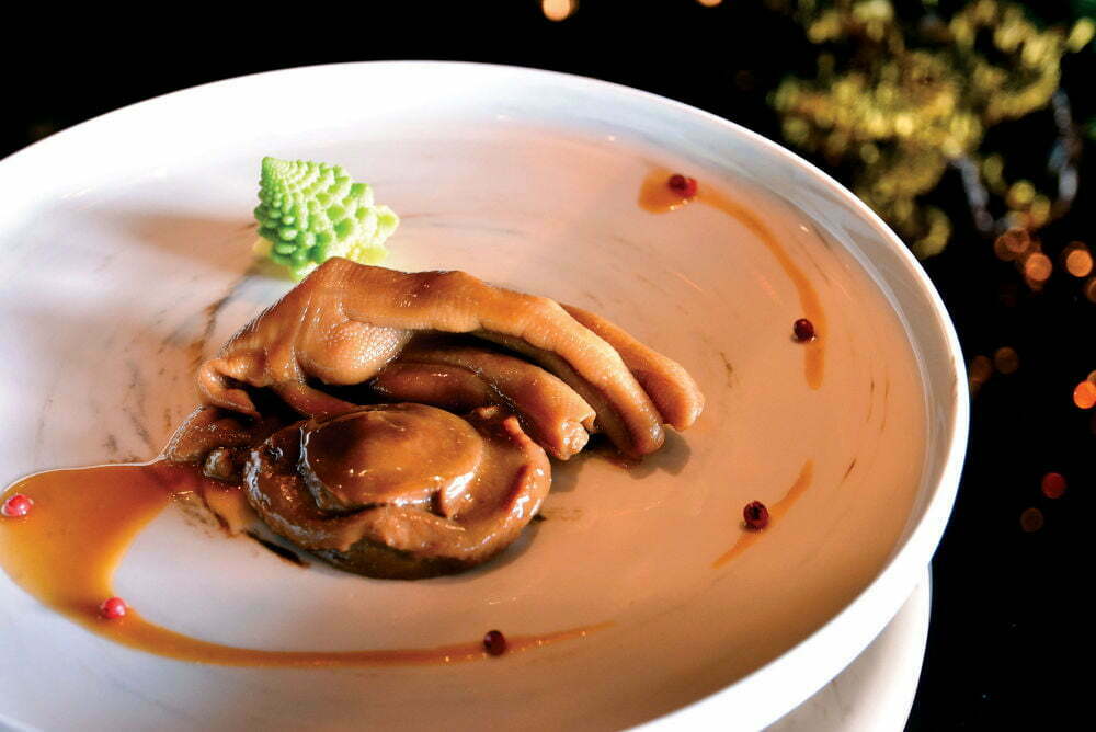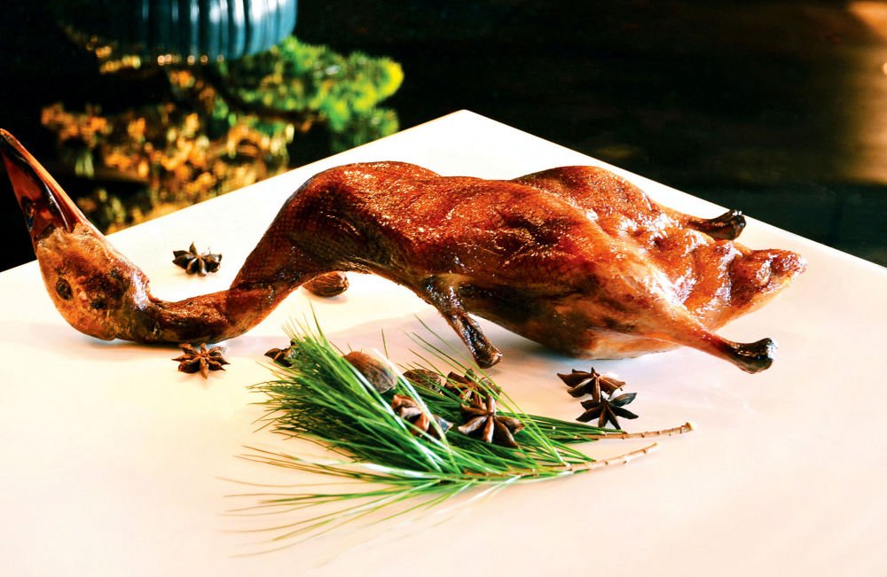 環境雅致舒適,不論是瓷器和仿古書畫,還是餐墊上對應時令的詩詞,處處展現古典氛圍。來自澳門的陳師傅精心鑽研廣東菜色,代表作包括先知鴨、火焰片皮鴨,以及烹調手法繁複的古法冬瓜帽,深受食客歡迎,須於兩日前預訂。此外,金銀蛋蒜香莧菜餃賣相精巧,滋味細膩,十分適合作為前菜,開啟這場精彩饗宴。