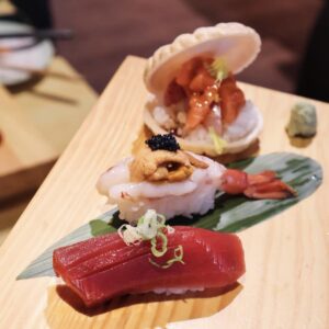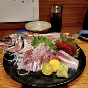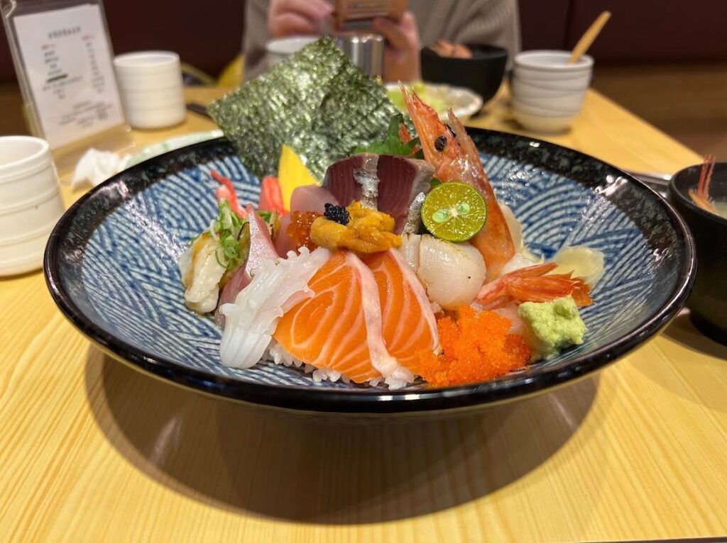 菜單提供定食(附沙拉、小菜、蒸蛋、味噌湯)、生魚片丼飯(附味噌湯)、卷壽司、沙拉、綜合刺身、綜合握壽司(附味噌湯)、手捲、揚物、烤物、蒸物、啤酒,