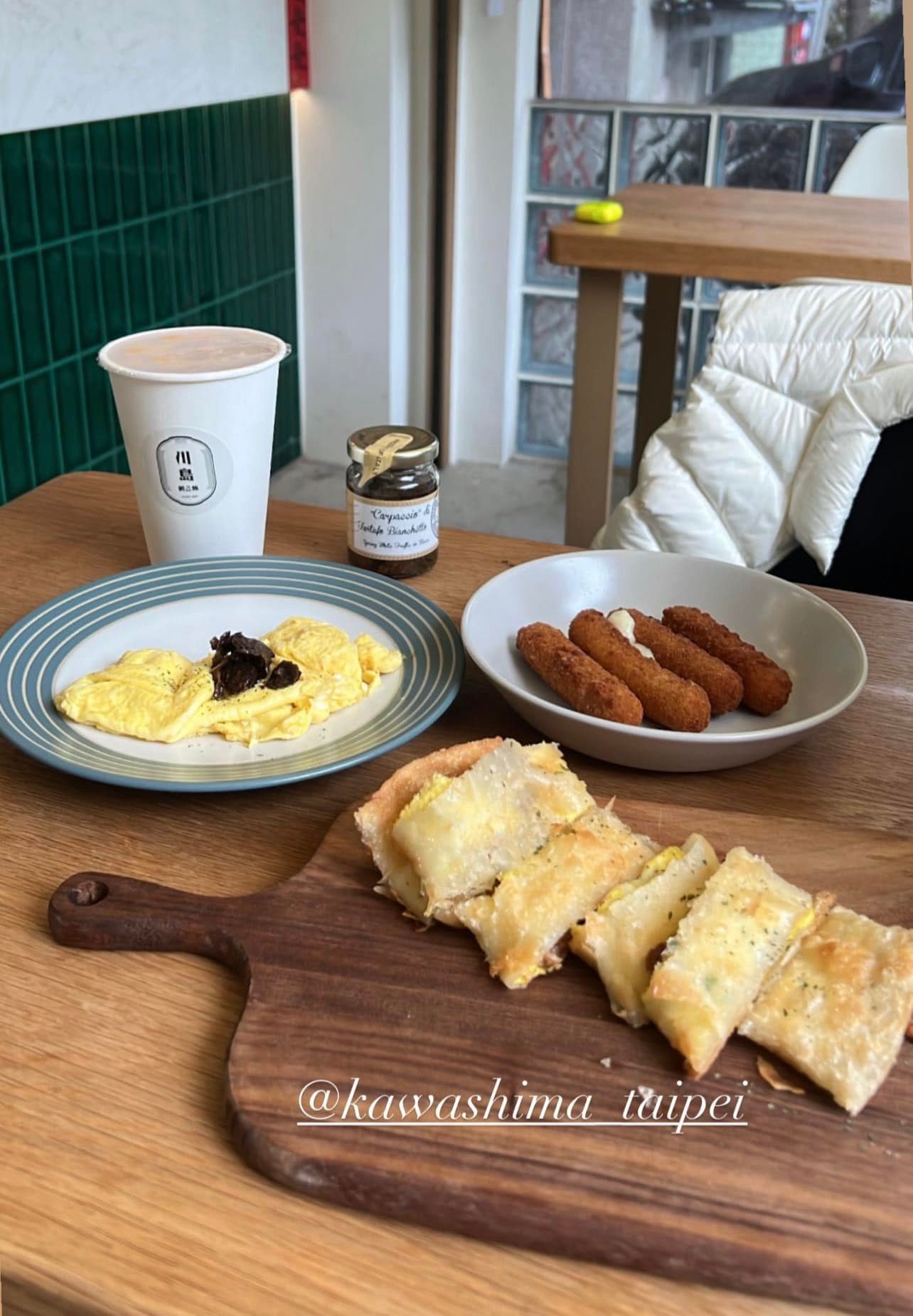 菜單提供蛋餅(可選煎或炸)、烤吐司(甜鹹可選)、鐵板麵、炸物、咖啡、飲品,