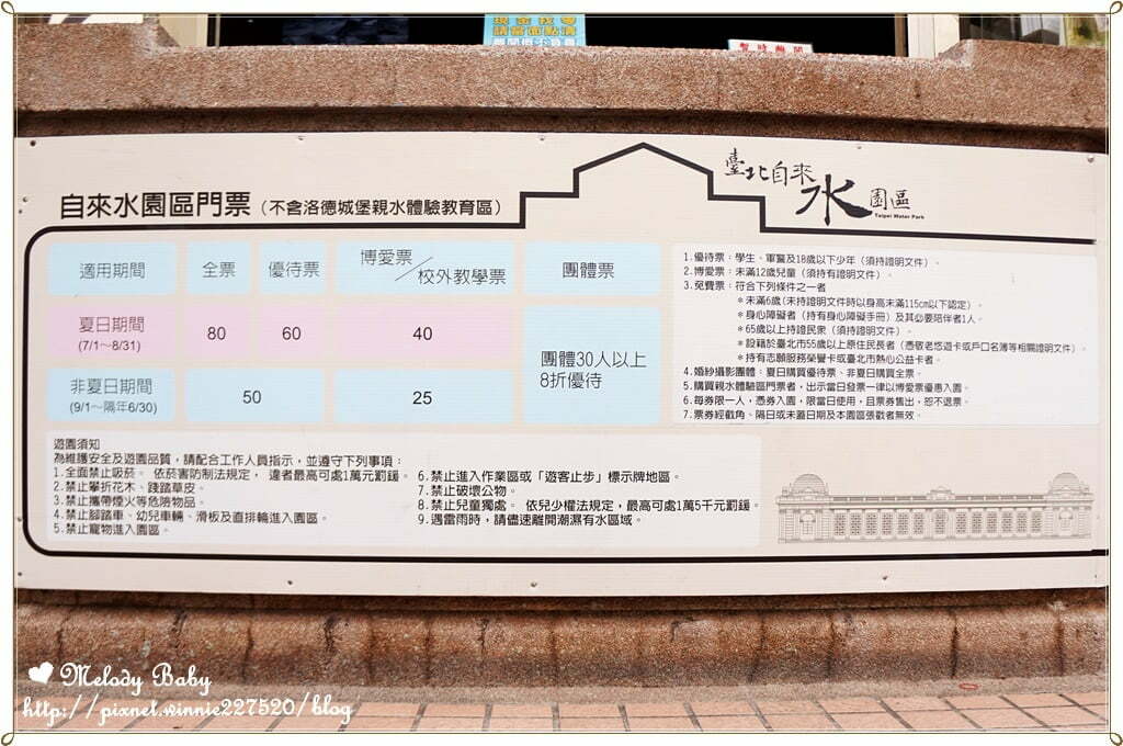 時光膠囊古蹟系列A.自來水博物館:前身為臺北水道唧筒室,於西元1908年完工,整體建築搭配前方花園,呈現新古典主義建築之歐式風情,更可細細欣賞古典列柱、破山牆、勳章飾,及內部現地陳列昔日抽水機組之空間規劃。