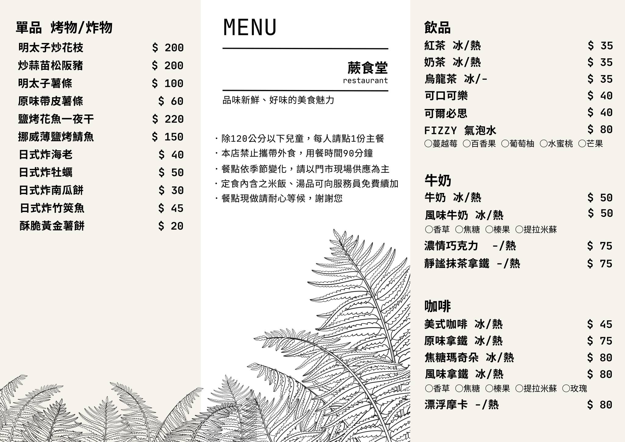 菜單提供經典早午餐、歐姆蛋捲套餐、熱壓吐司、玉子丼飯、定食、烤物、炸物,