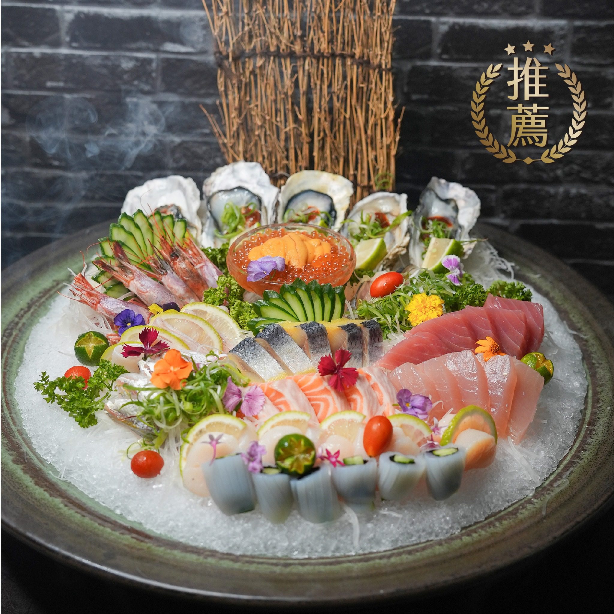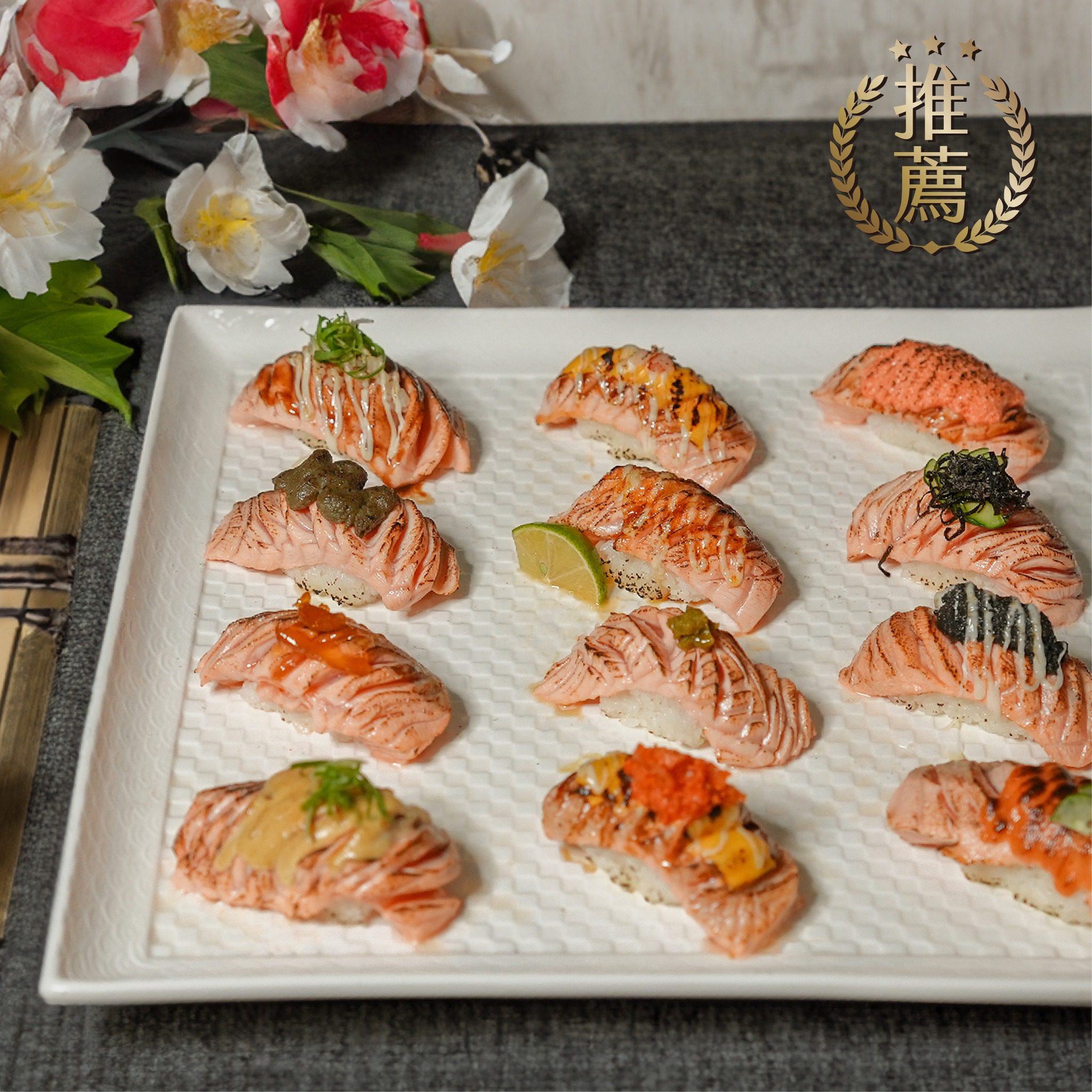 菜單提供刺身、手卷、生熟握壽司、稻荷壽司、海苔捲壽司、炙燒壽司、軍艦壽司、散壽司、逸品珍珠,