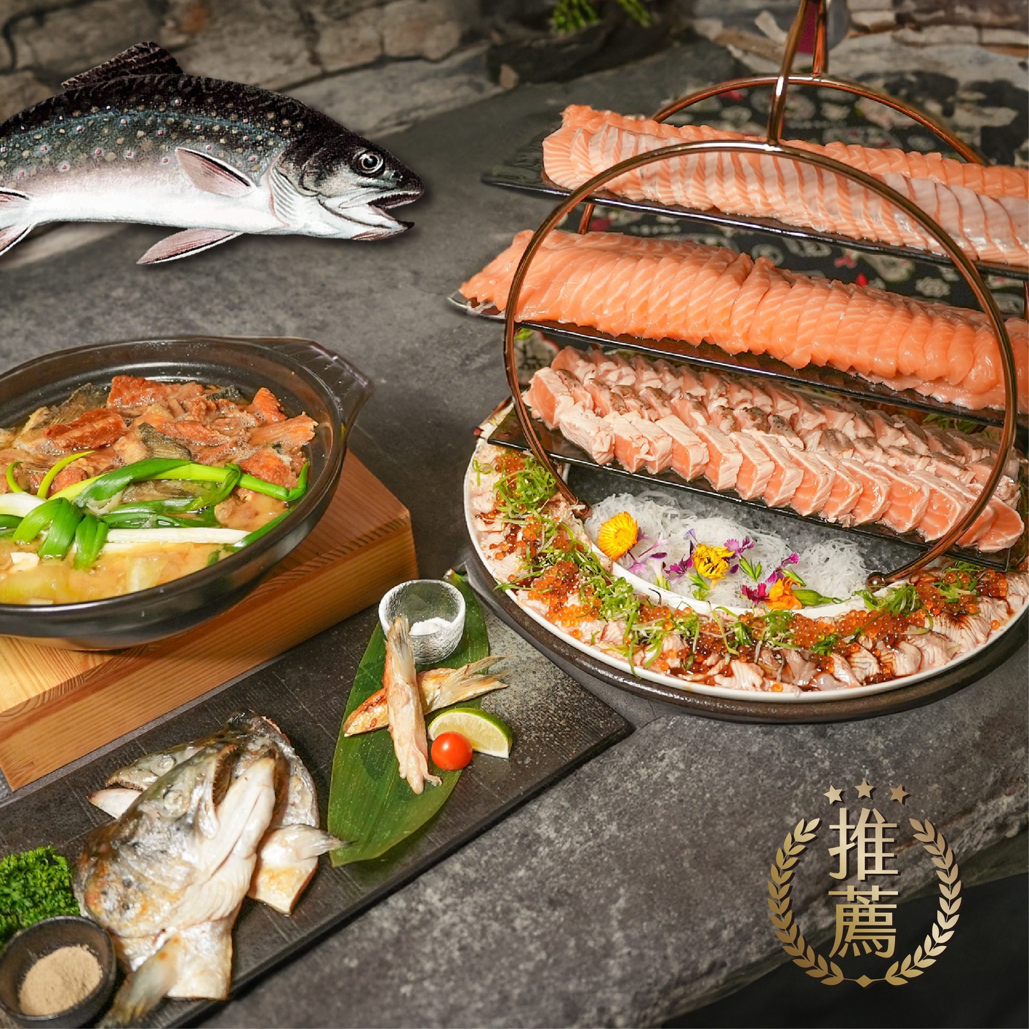 店內更有諸如頂級海鮮丼、盛合厚切鮭魚、炙燒大集合、巨無霸刺身蛋糕、痛風海鮮鍋、一鮭多吃、一斤丼等多種超有特色巨無霸浮誇系列可選擇喔!